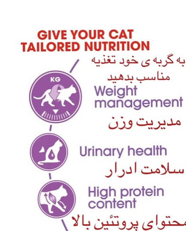 مناسب برای گربه های ۷ ساله عقیم شده کمک به حفظ وزن ایده آل بهبود عملکرد دستگاه گوارش کمک به حفظ سلامت دستگاه ادراری حاوی ۳۷% پروتئین جهت حفظ عضلات بدن استحکام استخوانها و سلامت مفاصل گربه حاوی ال کارنیتین برای چربی سوزی ساخت فرانسه